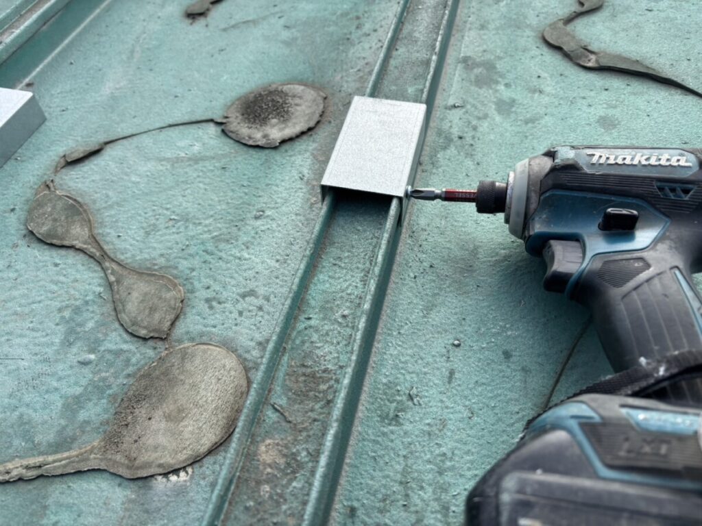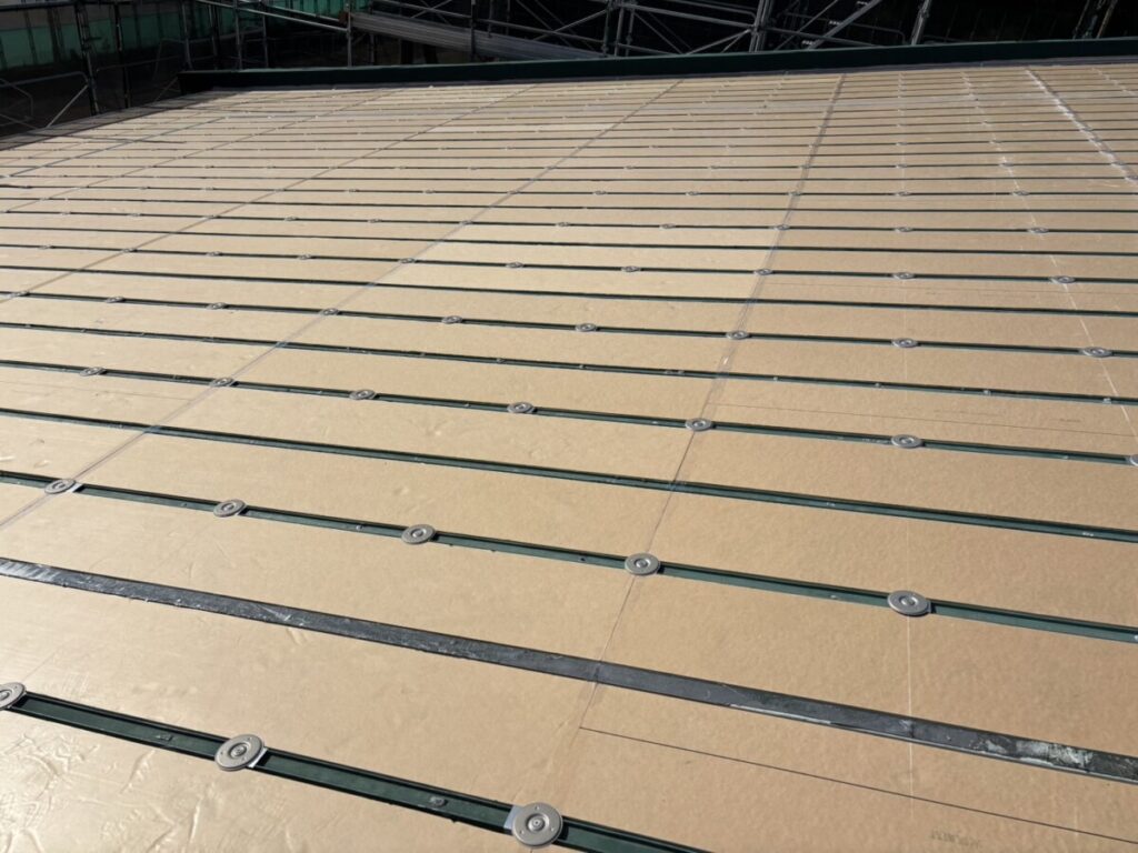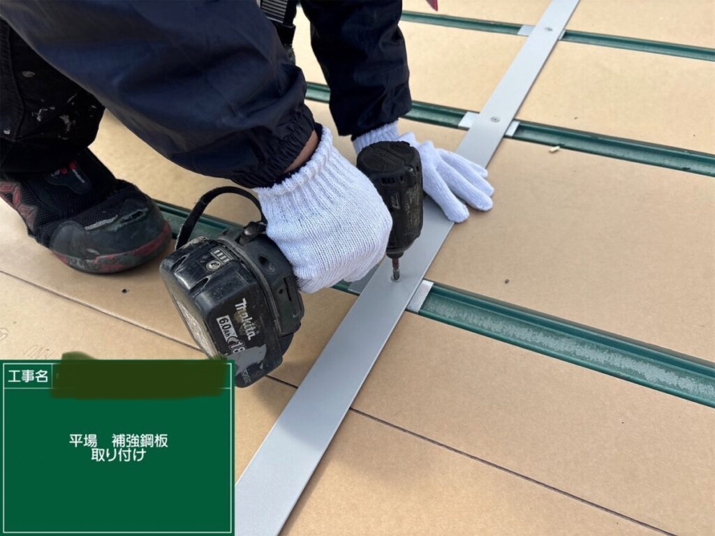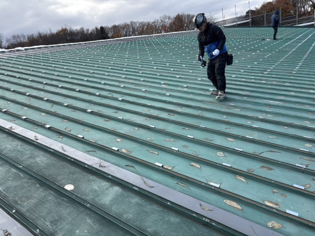棟部分も補強鋼板の上に塩ビシート機械固定の鋼板が設置されているのがわかります。